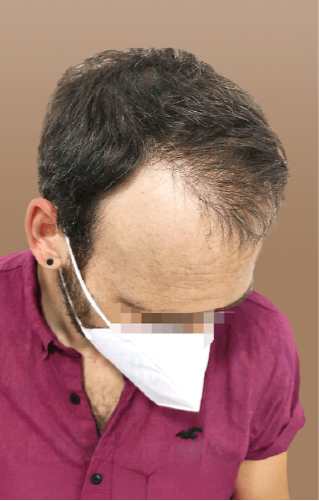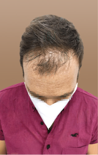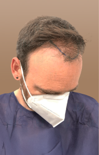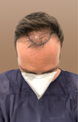 Evaluación inicial del paciente, donde se observa el tercio frontal claramente afectado por la alopecia androgenética. Esta es la base desde la que partimos para establecer el plan quirúrgico adaptado a las necesidades y deseos del paciente.